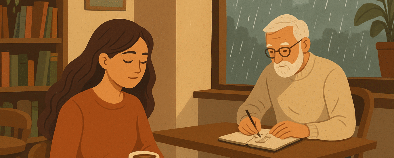 As she sipped her drink, she noticed an elderly man sketching in a notebook. His hand moved slowly, with the confidence of years of practice. Curious, Maya leaned a little closer and saw he was drawing people in the café — capturing their moods, their postures, even the sparkle in their eyes.